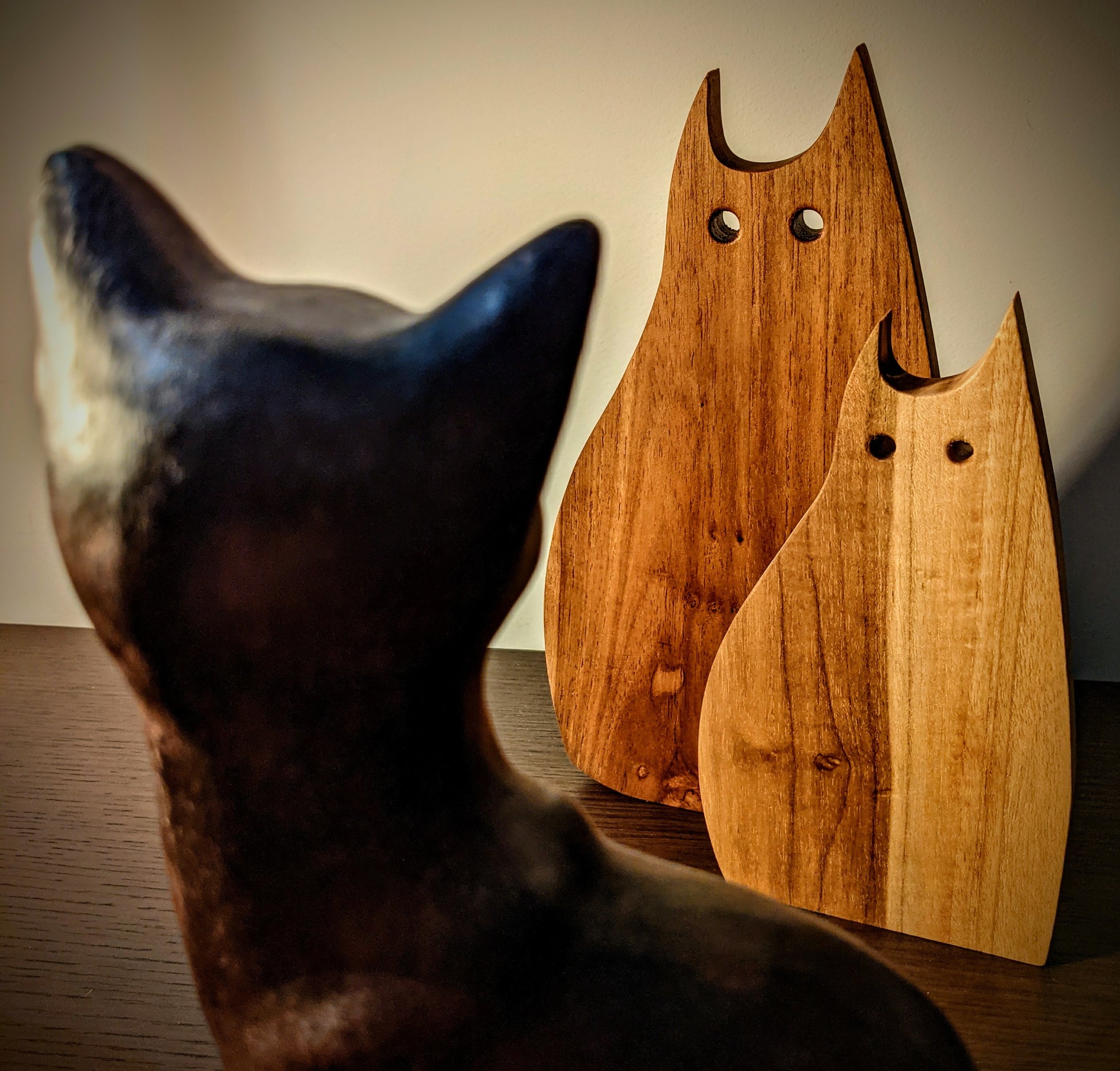 Silhouette de chat en bois de teck pour la décoration intérieur. Chaque duo est unique grâce au veinage du bois.