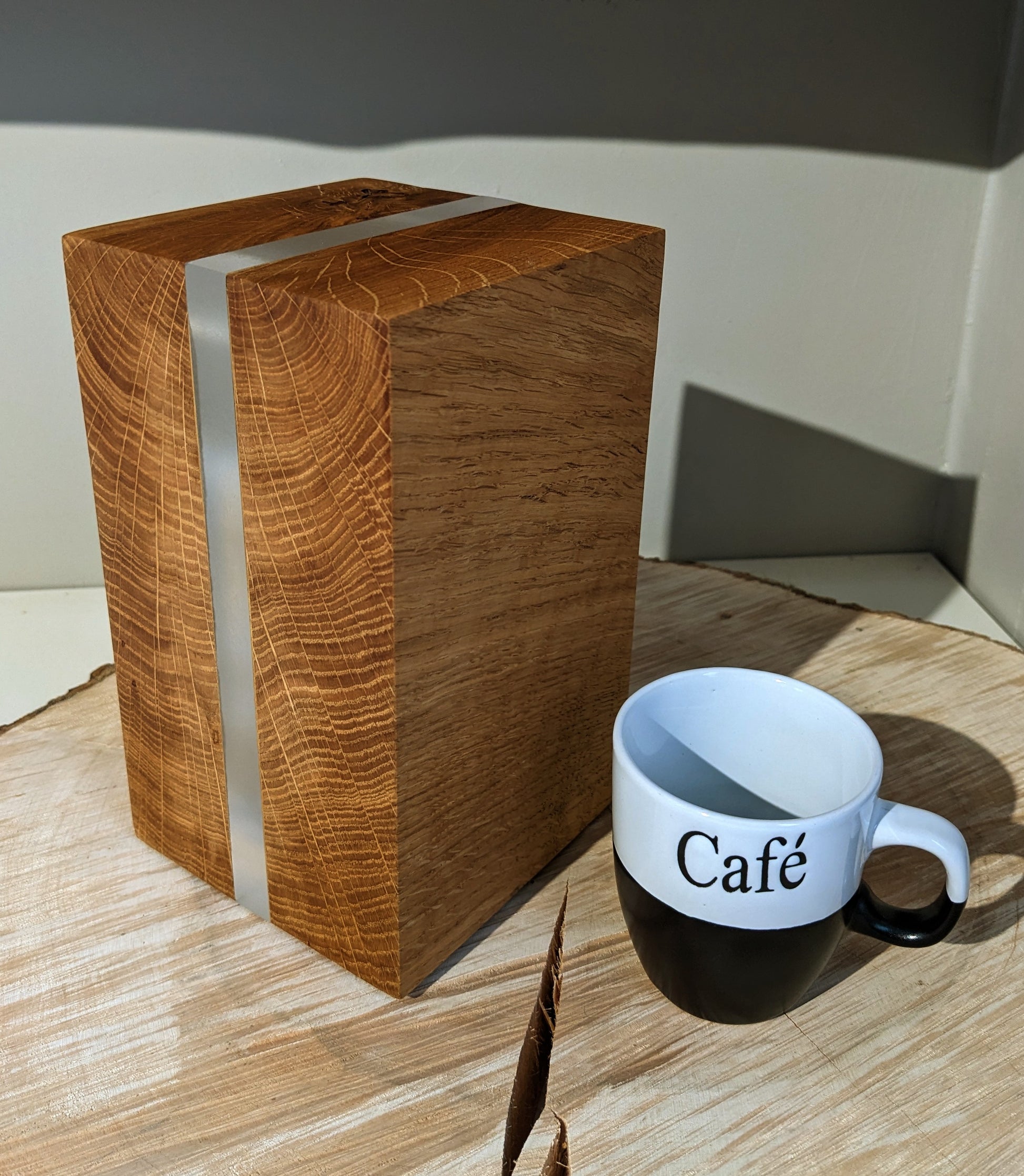 Lampe en bois de chêne massif. La lumière fournie par un ruban led est diffusée à travers une plaque de plexiglass.