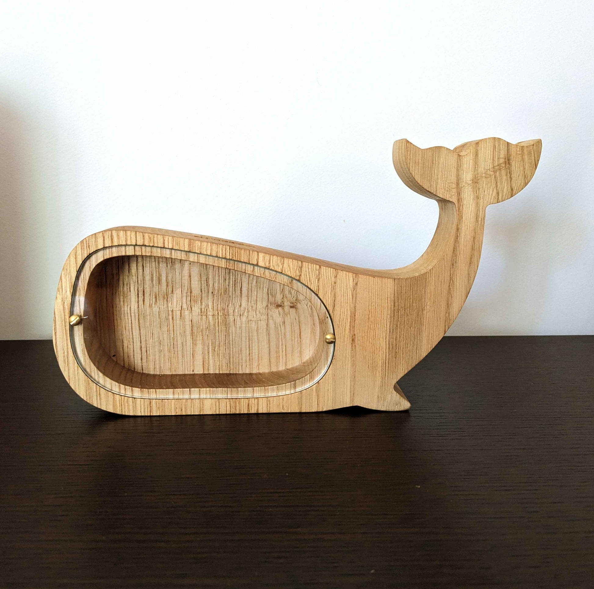 Tirelire en forme de baleine, directement fraisé dans du frêne massif.